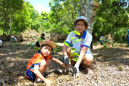 Các bạn nhỏ và phụ huynh cùng nhau trồng rừng
