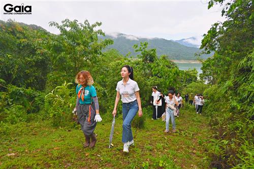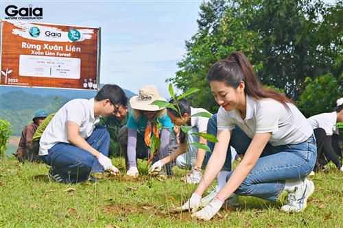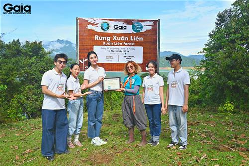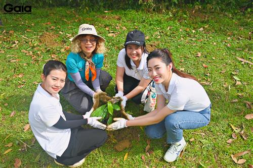 i diện Gaia trao giấy chứng nhận góp rừng cho Hoa hậu Lương Thùy Linh và đại diện LASHE Superfood