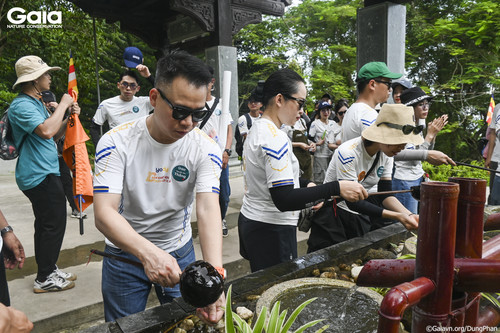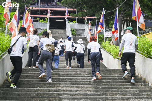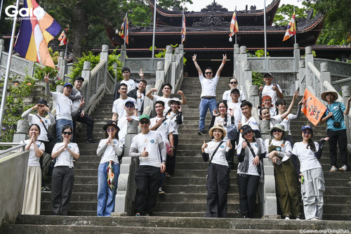 Chụp ảnh tập thể tại bậc thang lên chùa