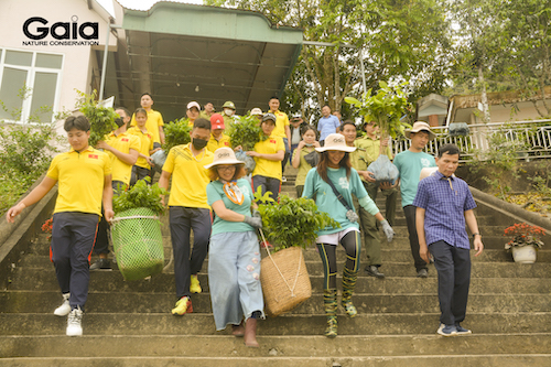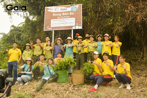 H'hen Niê, đội ngũ Gaia,cán bộ Ban quản lí VQG Bến En và các em học sinh địa phương chụp ảnh lưu niệm tại điểm trồng rừng