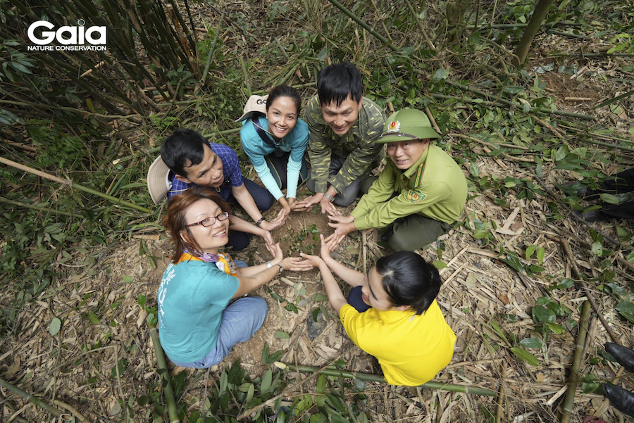 H'hen Niê cùng đội ngũ Gaia chụp hình lưu niệm bên bảng tên khu rừng