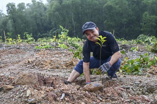 Chụp ảnh kỷ niệm với cây giống đầu tiên được trồng trên bãi thải