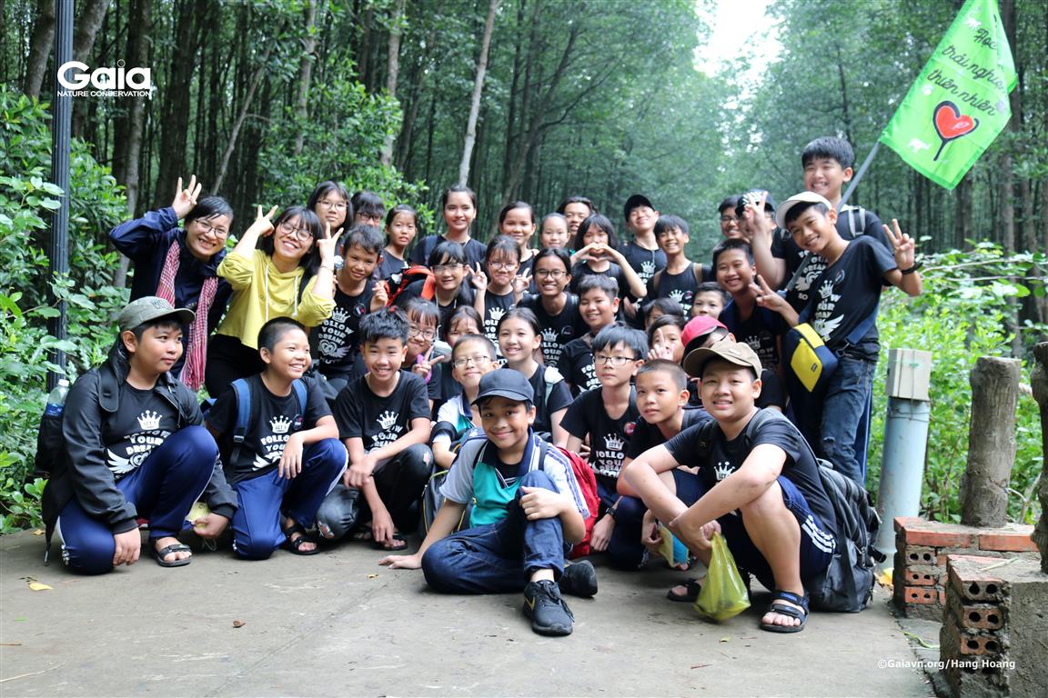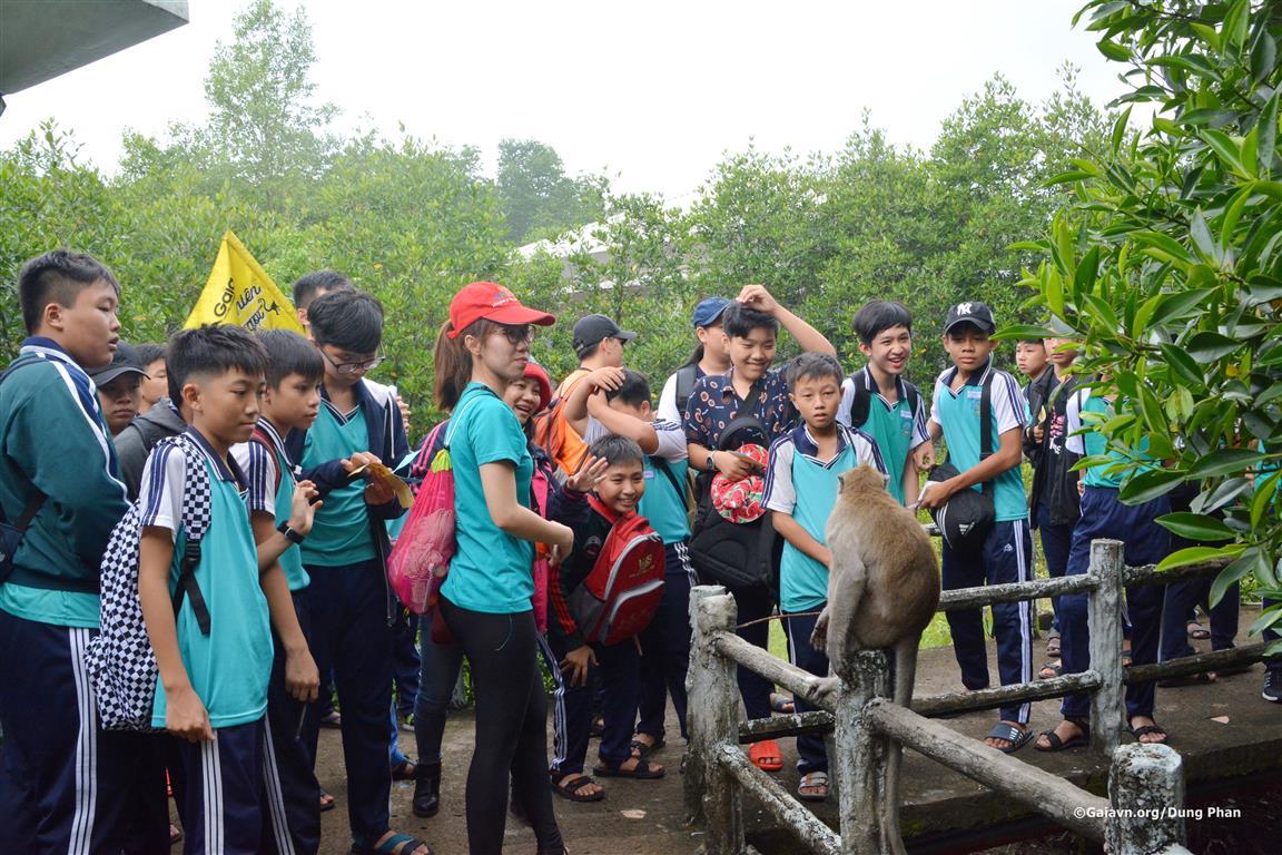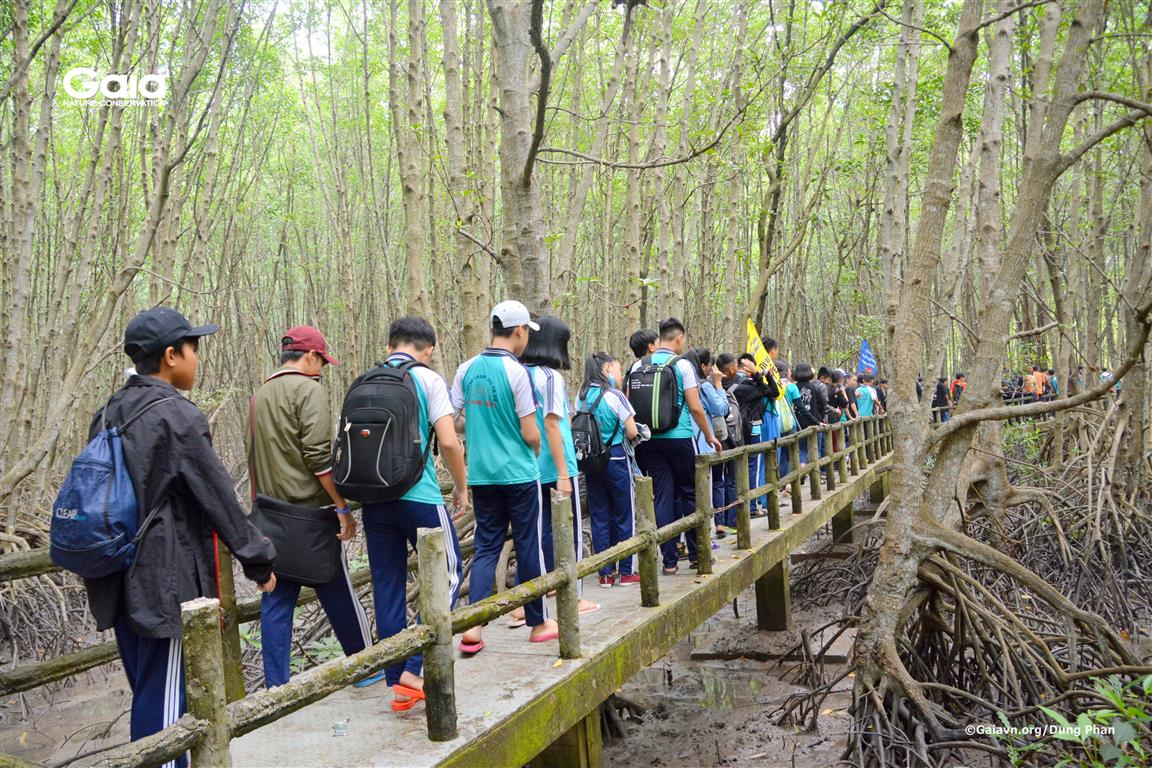 Học sinh hào hứng đi bộ khám phá rừng ngập mặn.
