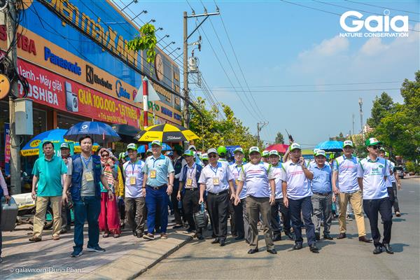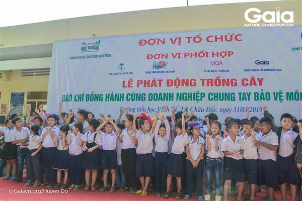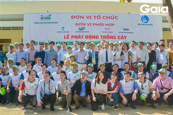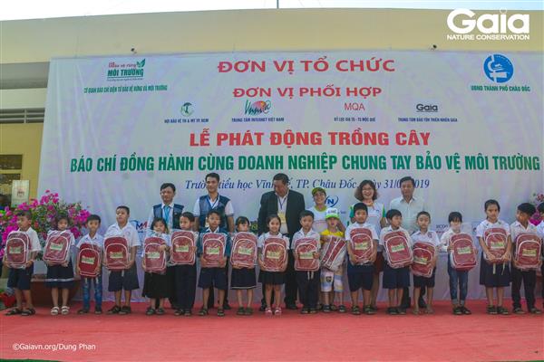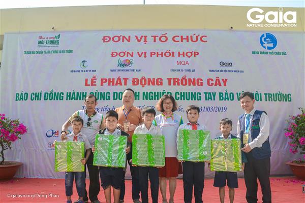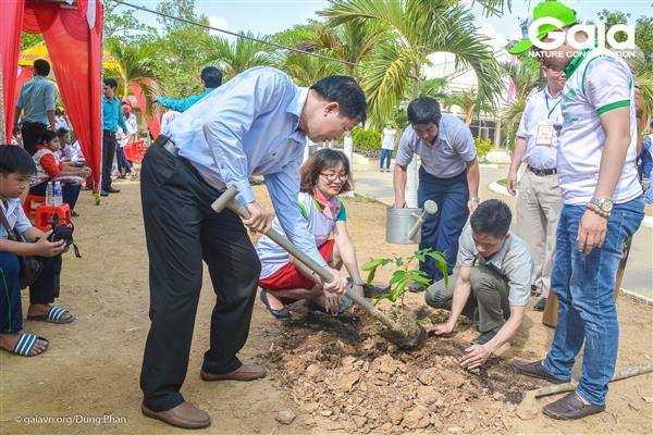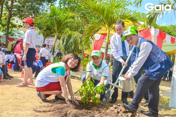 ng Nguyễn Thanh Tuấn trưởng ban tổ chức sự kiện (phải), Bà Đỗ Thị Thanh Huyền – Giám đốc Trung tâm Bảo tồn Thiên nhiên Gaia và các doanh nhân trồng cây bảo vệ môi trường tại Trường tiểu học Vĩnh Tế.