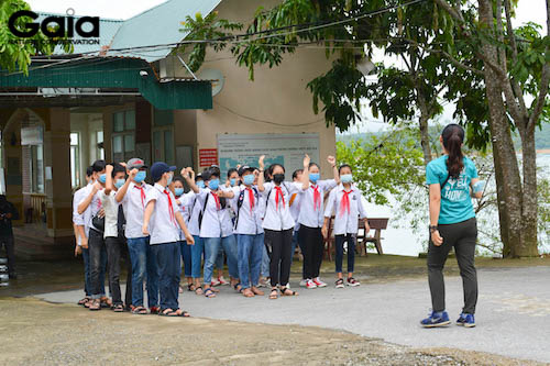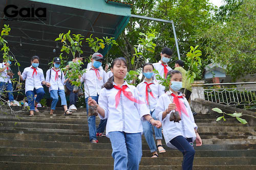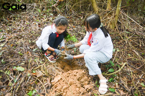 Quang Bảo hướng dẫn các em học sinh trồng rừng