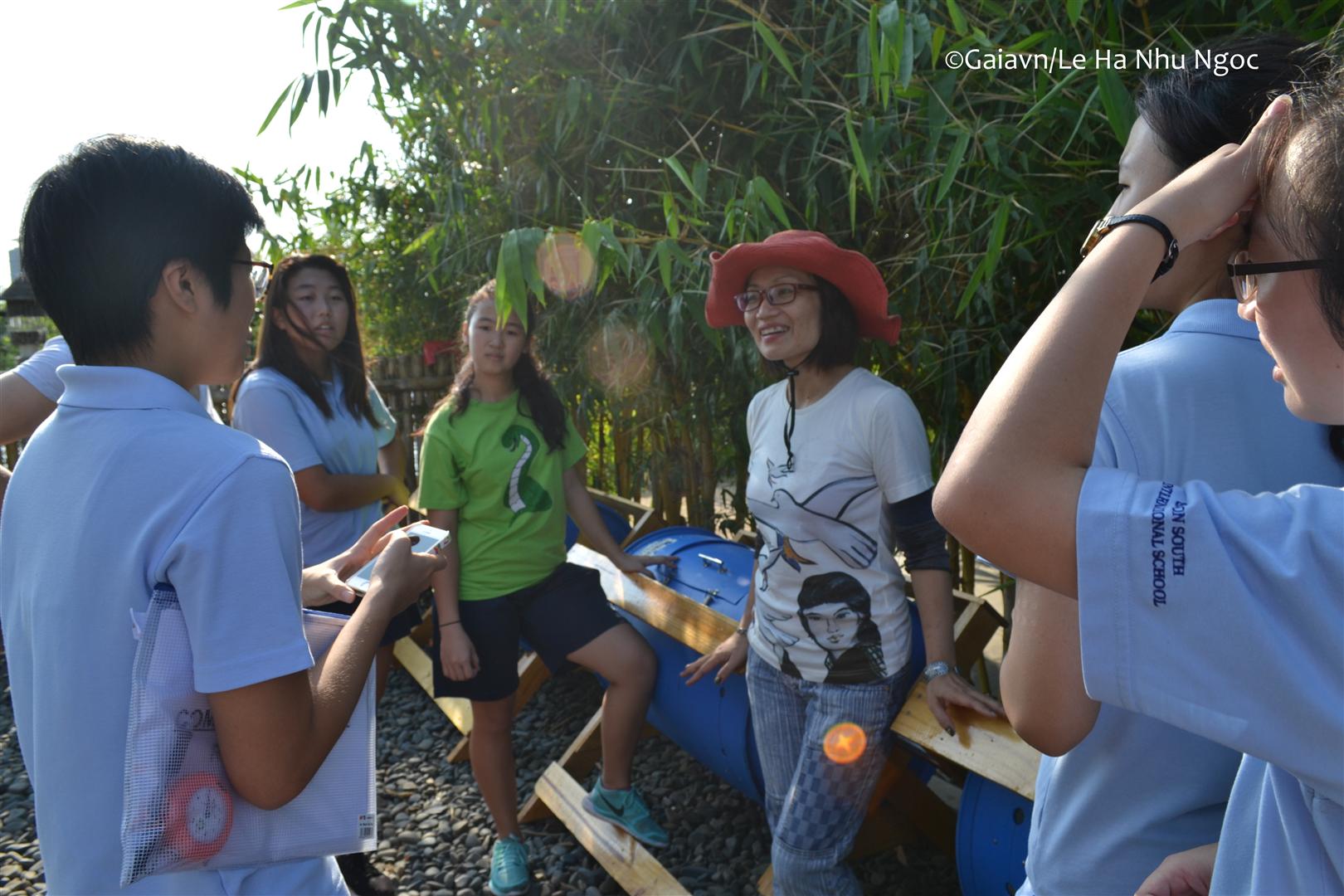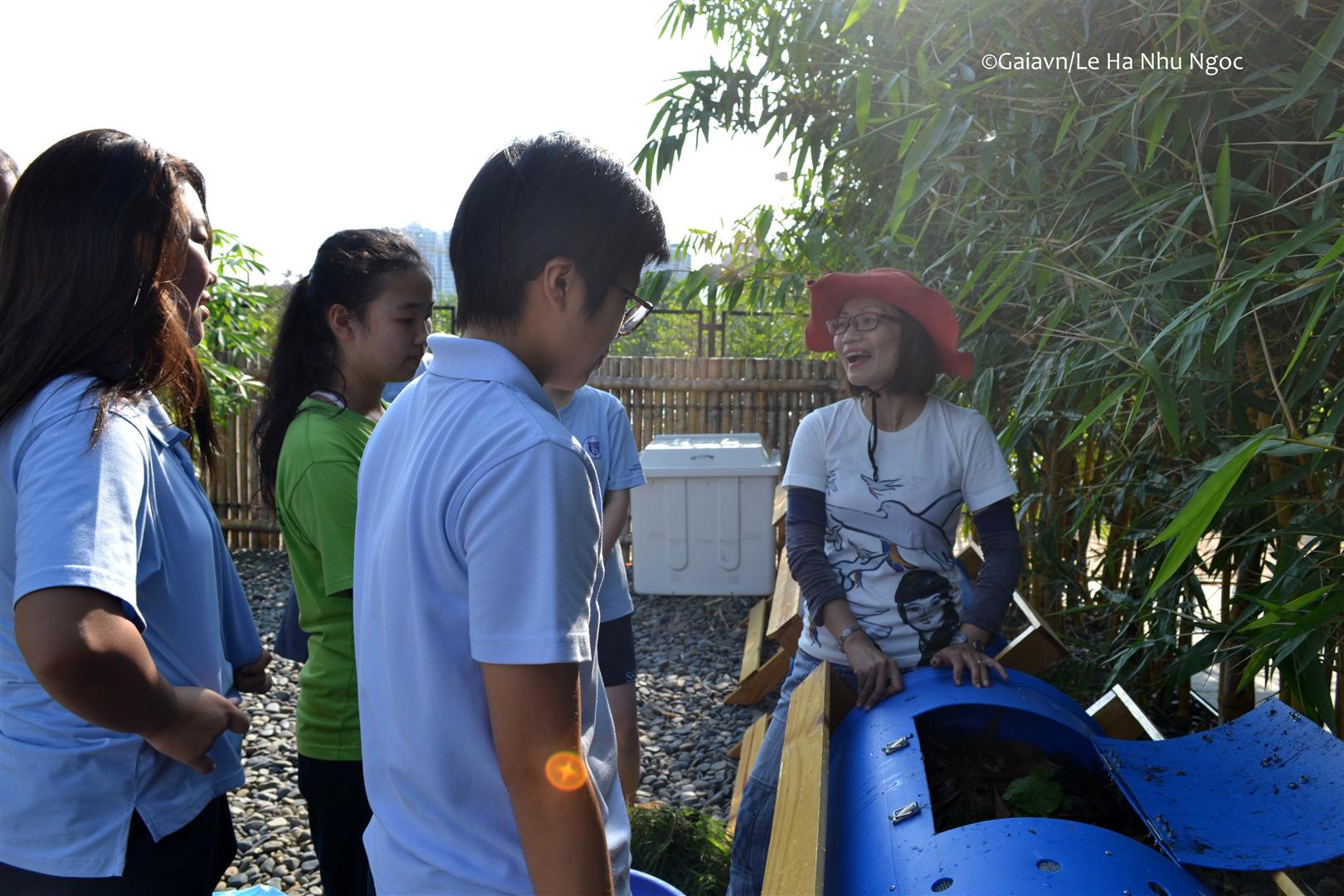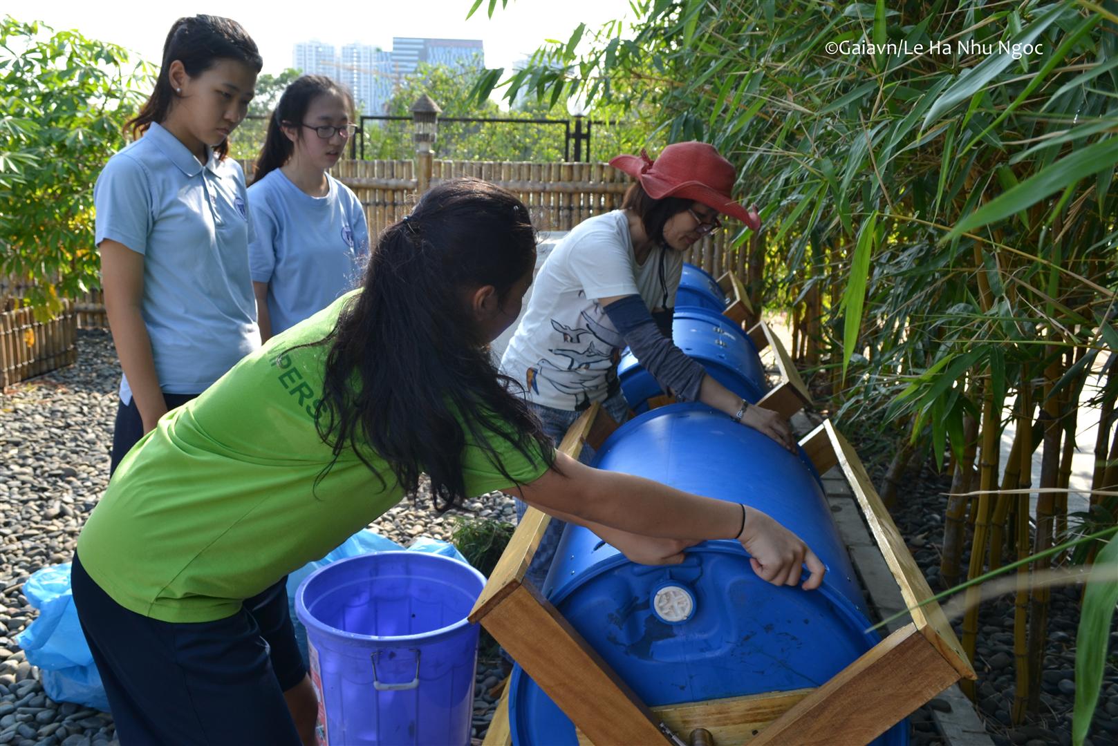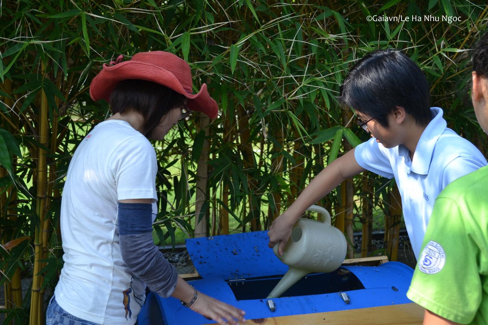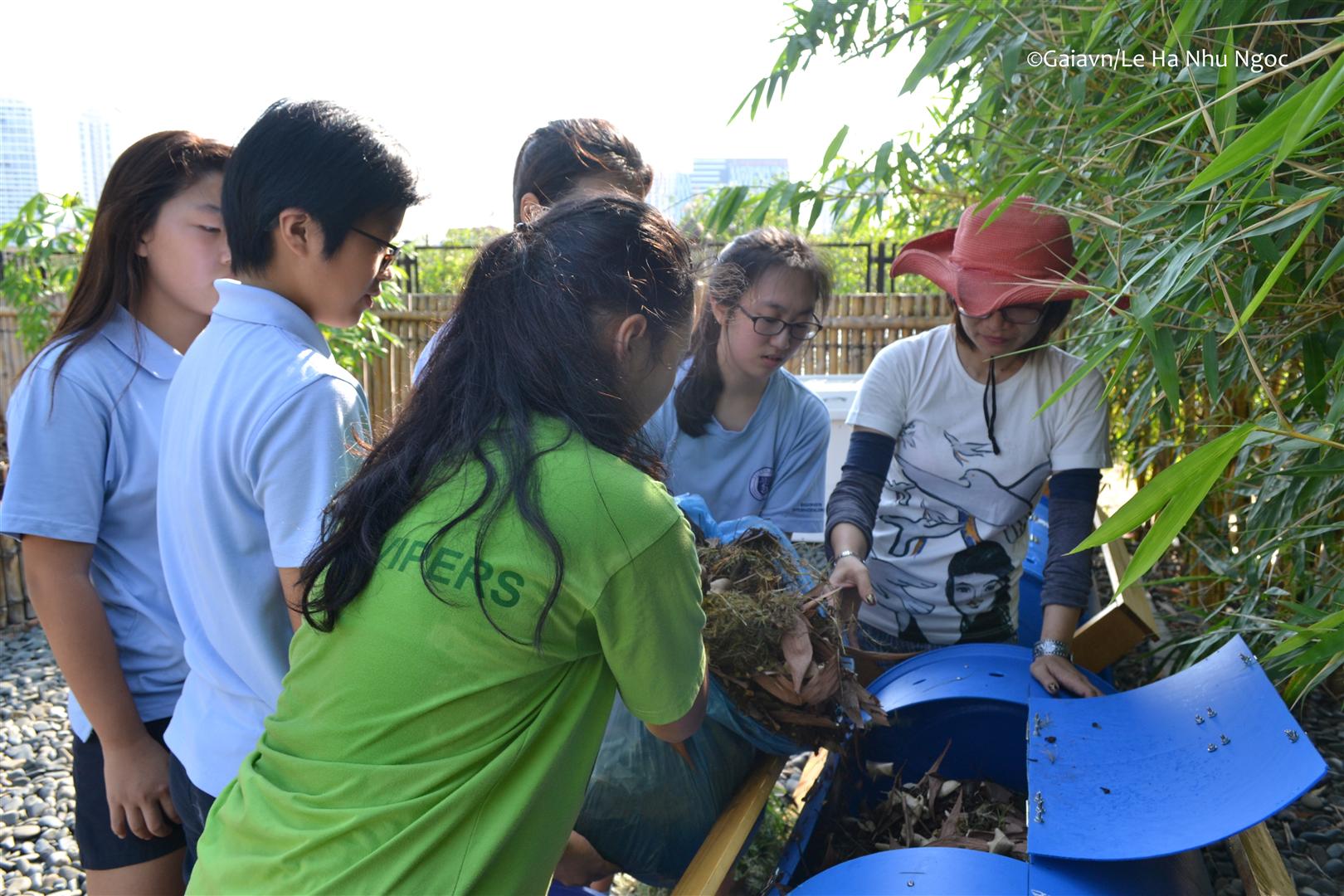 Học sinh đổ nguyên liệu vào thùng compost