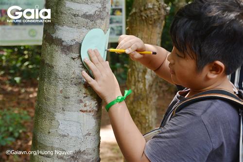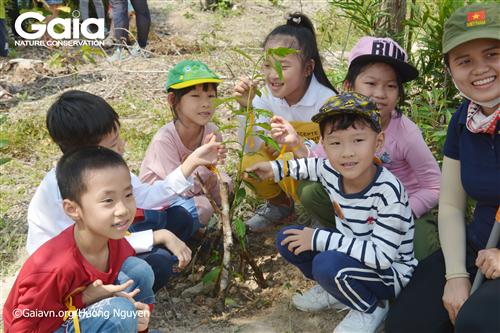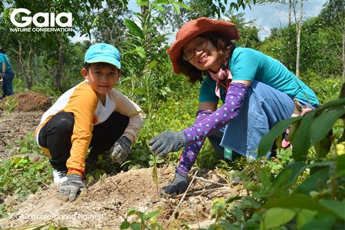 Giám đốc trung tâm bảo tồn thiên nhiên Gaia cùng em học sinh trồng cây Chiêu liêu.