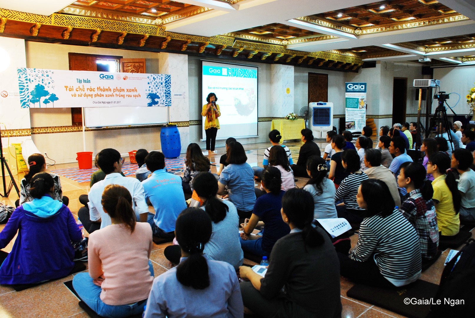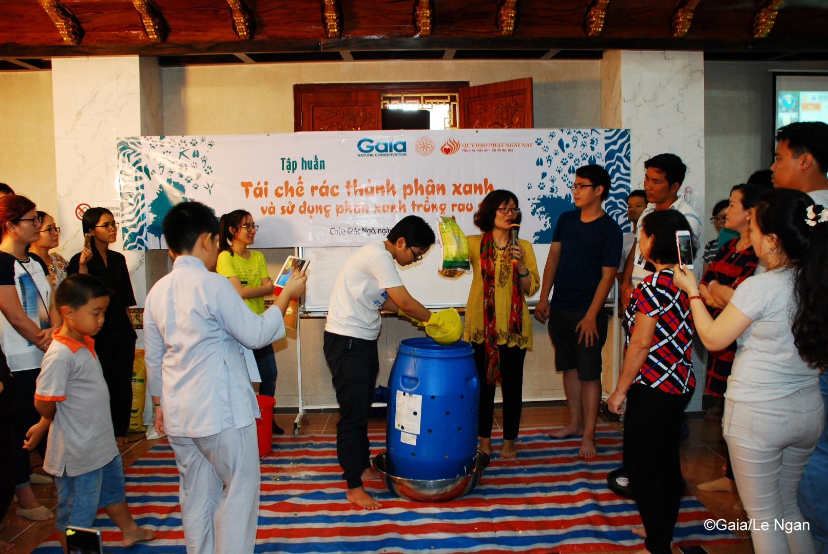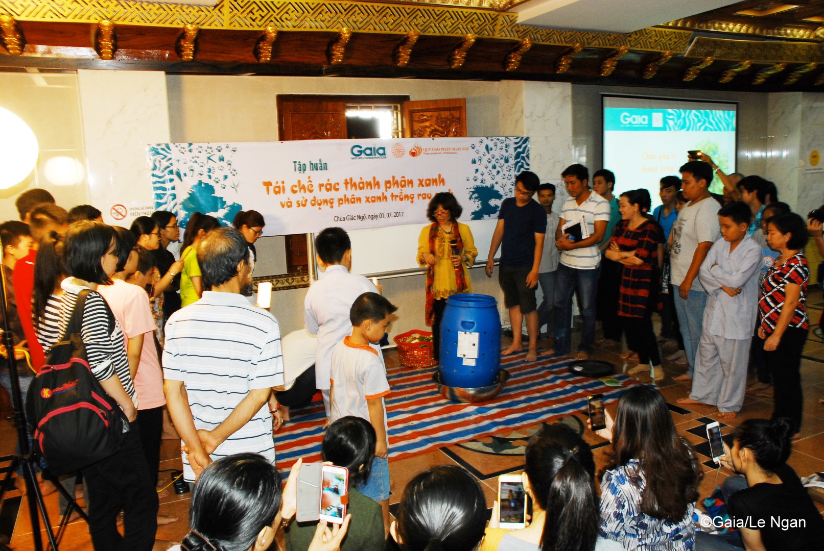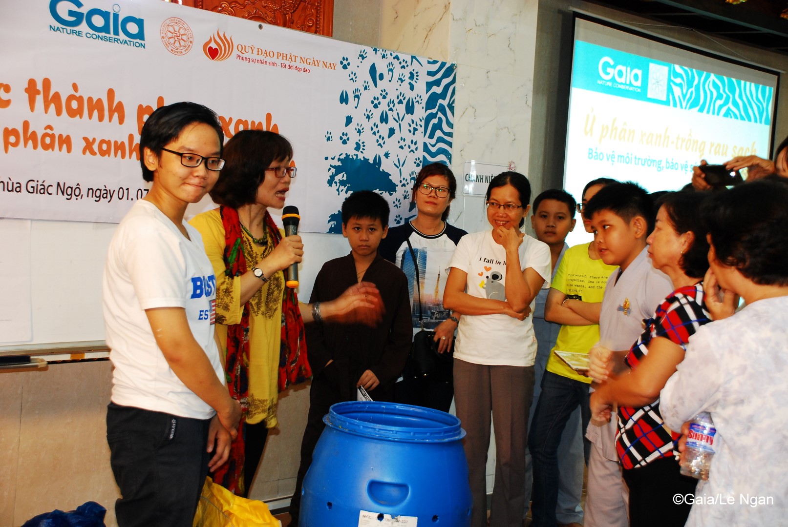Bà Đỗ Thị Thanh Huyền – Giám đốc Trung tâm Bảo tồn Thiên nhiên Gaia tập huấn cách làm phân xanh và sử dụng phân xanh trồng rau sạch