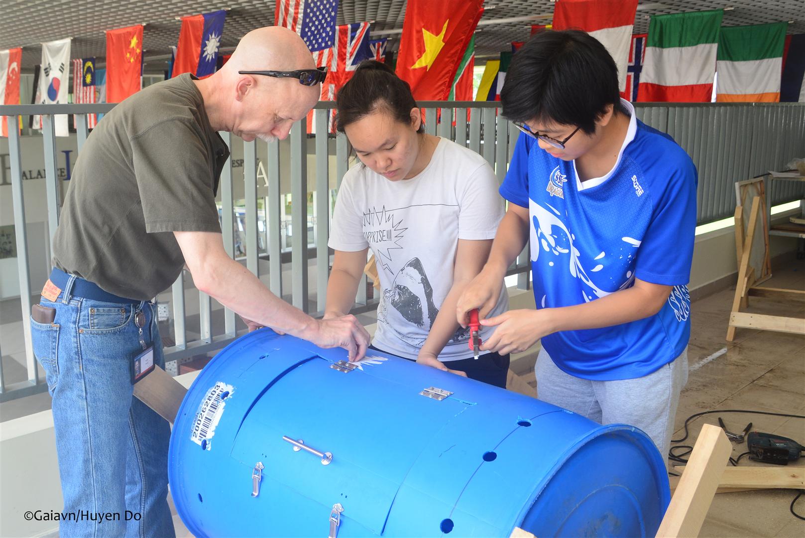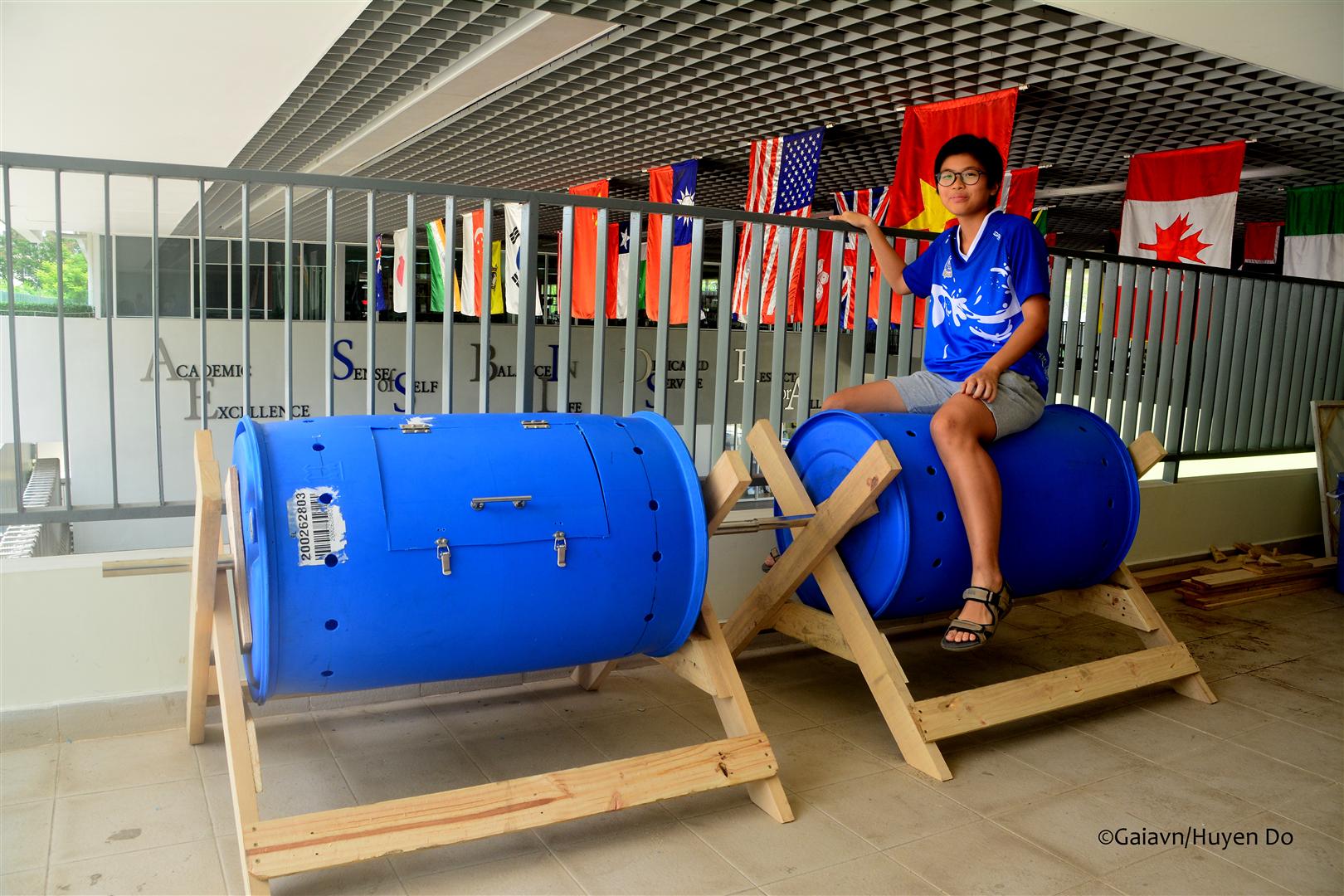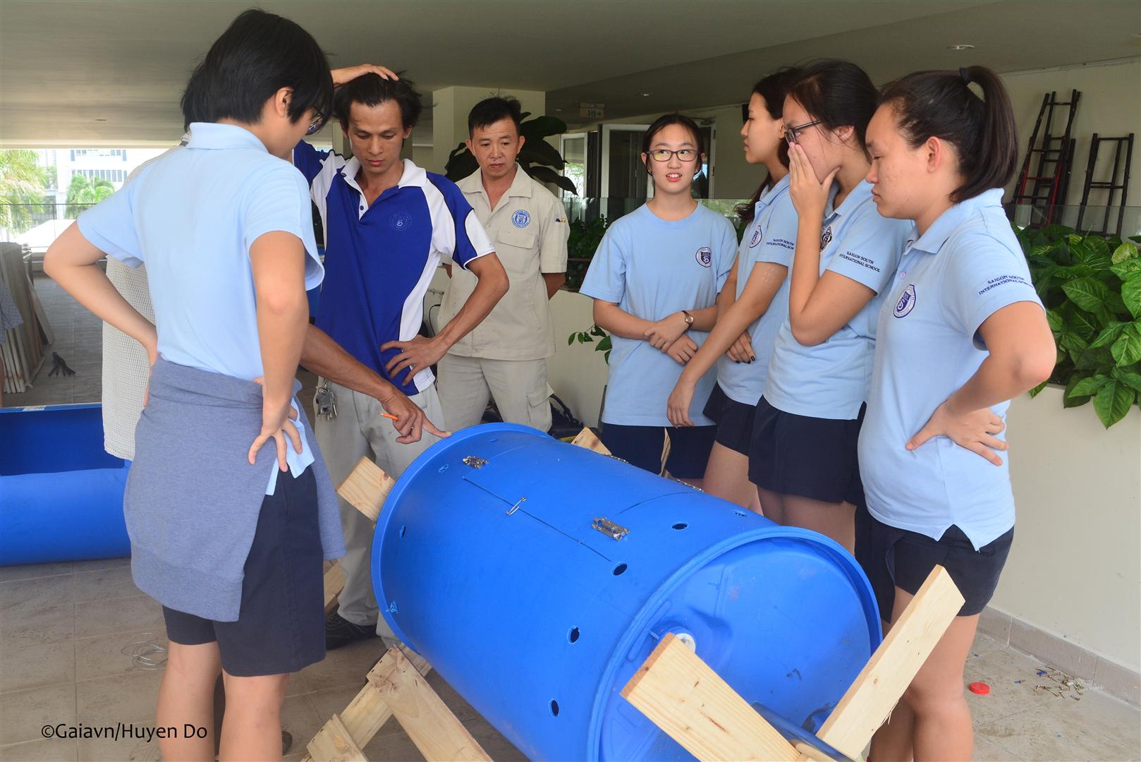 Học sinh trường Quốc tế Nam Sài Gòn đang nghe hướng dẫn chế tạo thùng compost
