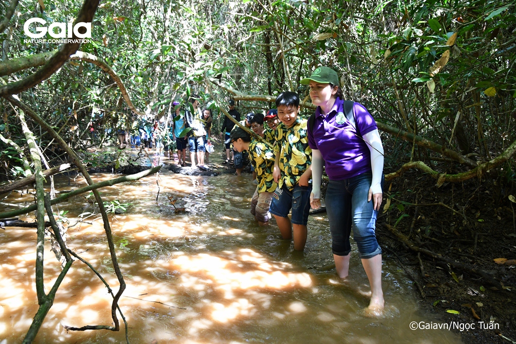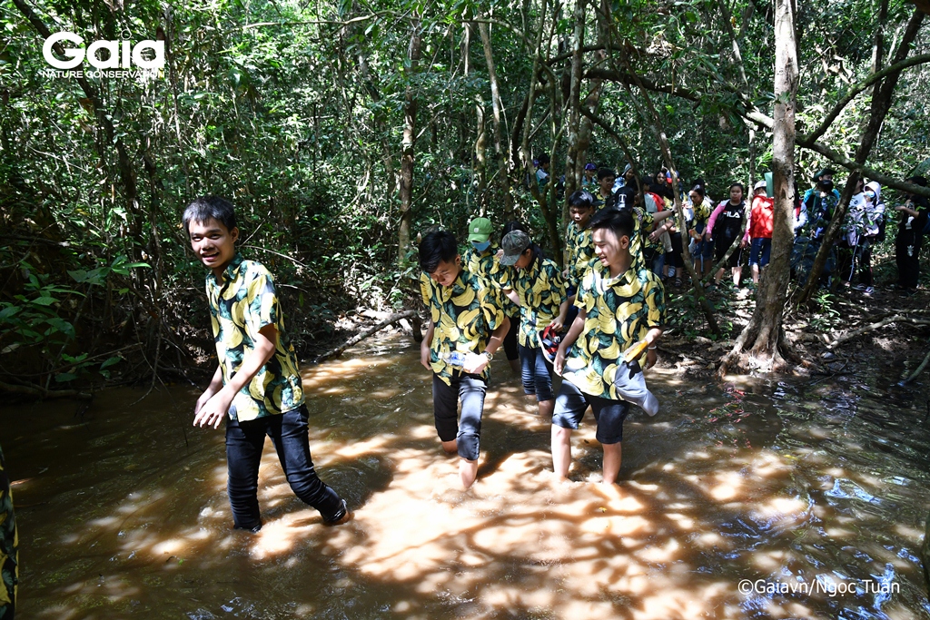 Học sinh thích thú khi lần đầu tiên được lội suối trong rừng