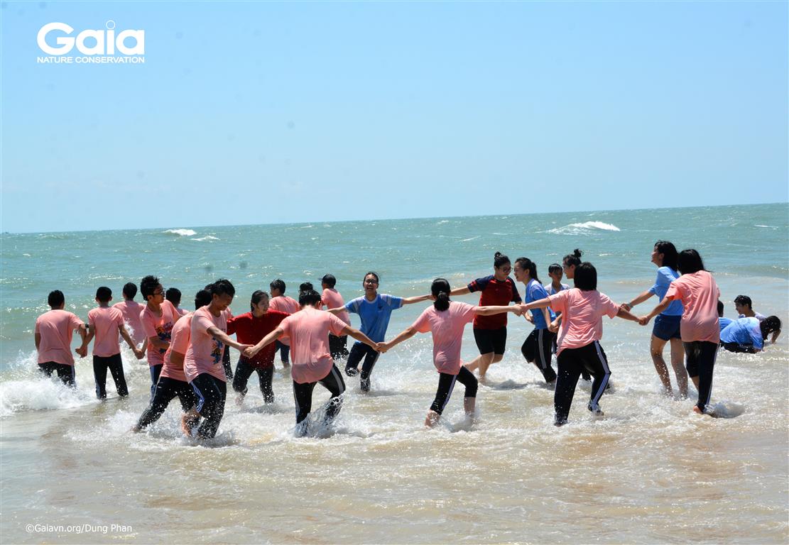 Tại Khu Du lịch Rừng và Biển, học sinh được trổ tài đắp cát tạo hình sinh vật biển quý hiểm như rùa biển, cá voi, dugong… Học sinh đã vô cùng thích thú khi được cùng bạn bè, thầy cô chơi các trò chơi tập thể và vui đùa với sóng biển.