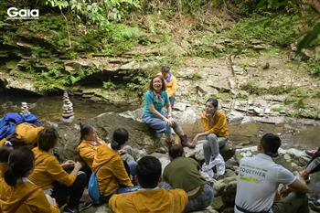 Đặc biệt ở giữa rừng xanh bên dòng suối trong mát, thành viên đoàn Faslink được nghe câu chuyện về thiên nhiên và bảo tồn, thời kỳ đại tuyệt chủng lần thứ 6 từ chị Đỗ Thị Thanh Huyền chia sẻ. Chị Huyền - Giám đốc Trung tâm Bảo tồn Thiên nhiên Gaia, người có hơn 20 năm kinh nghiệm về bảo tồn thiên nhiên và thiết kế hành trình trải nghiệm Bạch Mã. Trải nghiệm tắm rừng không thể thiếu trong hành trình trải nghiệm thiên nhiên của Gaia để mọi người tái tạo năng lượng tích cực, xua tan những mệt mỏi công việc thường ngày.