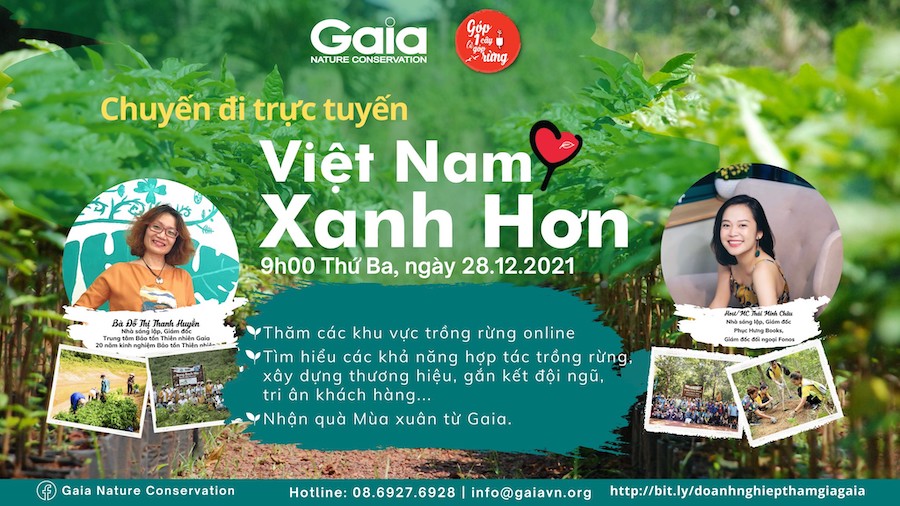 Nhằm kết nối các nguồn lực trồng rừng to lớn từ các doanh nghiệp, Trung tâm Bảo tồn Thiên nhiên Gaia đã tổ chức chương trình “Việt Nam Xanh Hơn”. Đây là chuyến đi trực tuyến đến thăm 5 khu rừng đặc dụng đầu nguồn trải khắp Việt Nam mà Gaia đang nỗ lực phủ xanh, bao gồm Rừng Xuân Liên và Bến En tại Thanh Hóa, rừng Bạch Mã tại Thừa thiên Huế, rừng Đồng Nai tại tỉnh Đồng Nai và rừng Cà Mau tại tỉnh Cà Mau. Chuyến đi trực tuyến Việt Nam Xanh hơn đã giúp các doanh nghiệp được tận mắt thấy các khu rừng, trao đổi với các cán bộ địa phương, cán bộ và chuyên gia Gaia cũng như người dân địa phương, để hiểu rõ hơn về quy trình trồng và chăm sóc rừng bền vững.