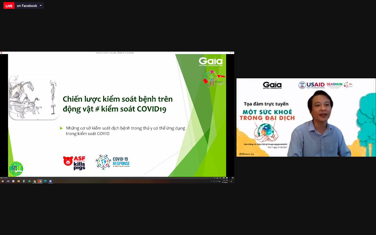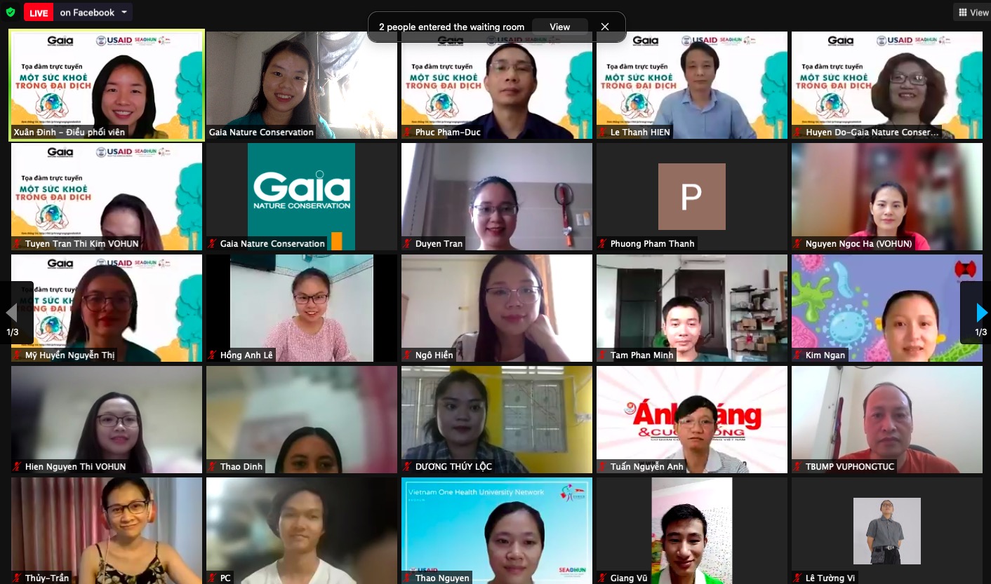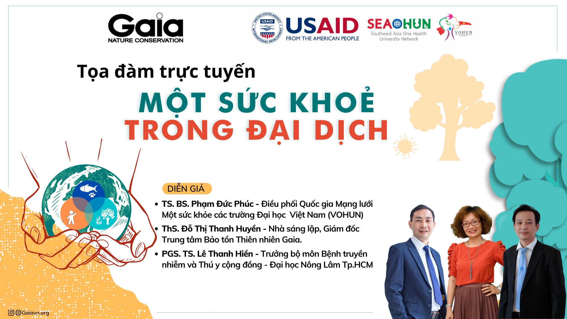Với mong muốn nâng cao nhận thức của cộng đồng về mối quan hệ giữa Covid-19 và việc bảo vệ thiên nhiên, thông qua cách tiếp cận Một sức khỏe, sáng nay, Trung tâm Bảo tồn thiên nhiên Gaia đã phối hợp với Mạng lưới Một Sức Khoẻ các trường Đại học tại Việt Nam (VOHUN) tổ chức buổi Toạ đàm Trực tuyến “Một Sức Khoẻ trong đại dịch”. Chương trình được thực hiện bởi 3 diễn giả uy tín với hàng chục năm kinh nghiệm trong lĩnh vực y tế cộng đồng, dịch tễ học, bảo tồn thiên nhiên. Buổi toạ đàm đã nhanh chóng thu hút hàng trăm lượt quan tâm, đăng ký. Đã có gần 100 người tham gia thảo luận trực tiếp với các diễn giải và hàng trăm lượt xem, theo dõi trên các kênh mạng xã hội.