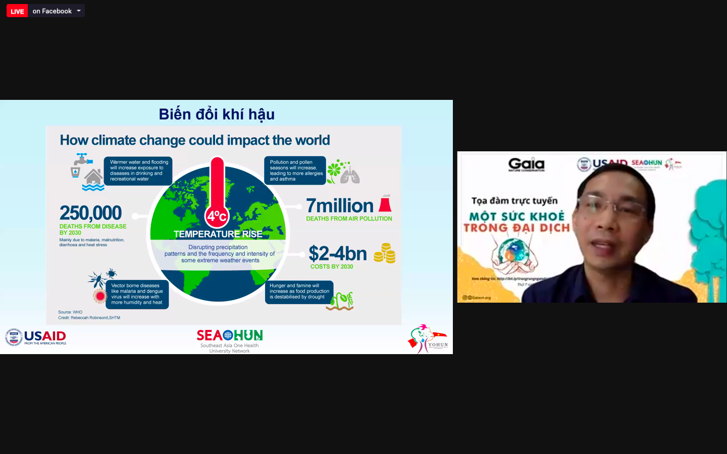 Diễn giả Tiến Sĩ. Bác Sĩ Phạm Đức Phúc - Điều phối Quốc gia của Mạng lưới Một sức khỏe các trường Đại học Việt Nam (VOHUN) đã khẳng định tại tọa đàm: “Phá rừng làm di chuyển các loài động vật hoang dã, khiến chúng gần gũi hơn với nhau và với con người. Điều này dẫn đến hệ quả làm tăng khả năng tiếp xúc của con người với các bệnh truyền nhiễm mới và khiến con người phải đối mặt với nguy cơ bị lây nhiễm với các đại dịch chết người, trong đó có COVID-19. Buôn bán động vật hoang dã, khai thác gỗ và phá rừng, cũng làm tăng nguy cơ lây truyền dịch bệnh. Việc cải thiện sức khỏe con người được thực hiện hiệu quả và bền vững nhất, thông qua cách tiếp cận “Một sức khỏe” trong đó không chỉ chú trọng về sức khỏe con người mà còn chú trọng thúc đẩy sức khỏe của các loài động thực vật và sức khỏe môi trường.”