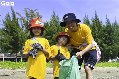 - Gia đình cùng dọn rác, góp sức vì biển xanh.