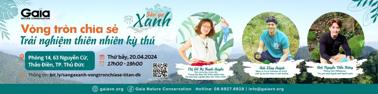 Hãy đăng ký ngay Vòng tròn chia sẻ - Trải nghiệm thiên nhiên kỳ thú! Hoạt động thuộc Sân ga xanh - một chuỗi các hoạt động kết nối cộng đồng do Trung tâm Bảo tồn Thiên nhiên Gaia tâm huyết tổ chức bởi với mong muốn lan tỏa tình yêu thiên nhiên, truyền cảm hứng sống tích cực, khát khao khám phá thế giới và phát triển bản thân.