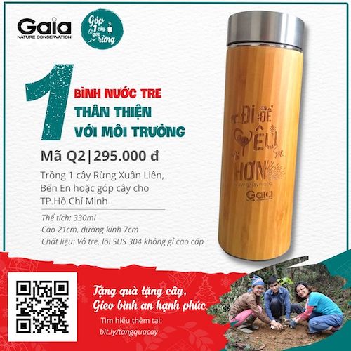 Nhân dịp này, Gaia xin hân hoan giới thiệu bộ QUÀ TẶNG CÂY XANH KỲ DIỆU, nhằm giúp bạn có được những món quà thật độc đáo ý nghĩa, để bạn trao gửi yêu thương thật trọn vẹn cho người bạn yêu quý! Khi chọn bất cứ món quà nào, như CÂY XANH KỲ DIỆU, bình nước tre YÊU THƯƠNG ĐONG ĐẦY, tranh vẽ BIẾT ƠN MẸ THIÊN NHIÊN, ảnh NHÂM DẦN THỊNH VƯỢNG, bạn đều đã cùng Gaia góp cây cho Rừng Xuân Liên, Rừng Bến En hay trồng cây trường học.