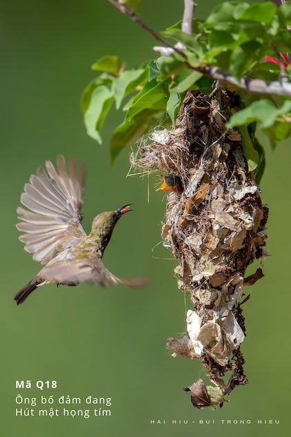 Nhiếp ảnh gia Bùi Trọng Hiếu có biệt danh là Hai Hiu, là người đặc biệt say mê và có duyên chụp ảnh chim và macro thiên nhiên. Hiu hay hiu hiu là trạng thái của các loài chim khi đang bay hiu hiu hút mật hoa hay mớm mồi cho con.