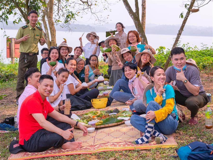 Trải nghiệm ăn trưa giữa rừng với các món ăn dân dã thơm ngon cùng các bác người dân trồng rừng.
