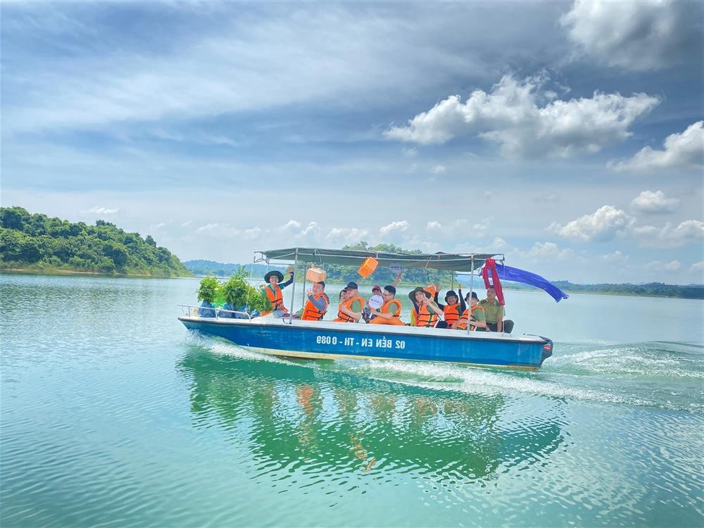9.30 Băng Hồ Sông Mực bằng cano, mang theo cây giống đến với địa điểm trồng rừng trên đảo.