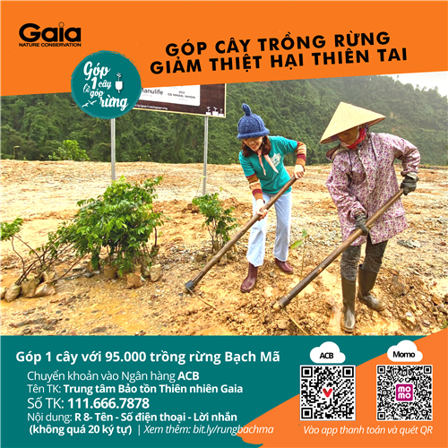 Cách 1. Chuyển khoản vào Ngân hàng ACB, Tên TK: Trung tâm Bảo tồn Thiên nhiên Gaia, Số TK: 111 666 7878. Nội dung: R8- Tên bạn - Số điện thoại - Lời nhắn trên khu rừng (không quá 20 ký tự)